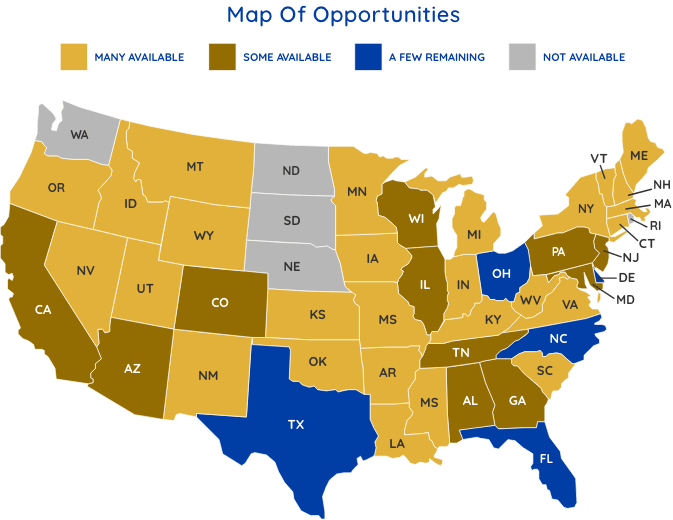 We look to medium and larger sized metropolitan areas to define the exclusive territory, and then award based on population. That means we’re expanding quickly, so there are always opportunities available. If you see one that interests you, contact us today to learn more.